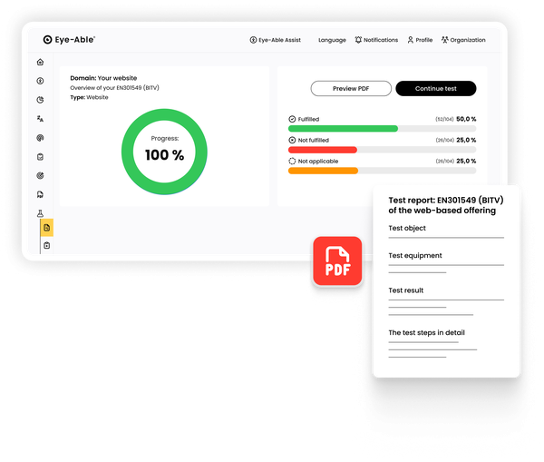 For businesses, this is essential. Only manual testing enables a complete assessment against legal requirements such as EAA and WCAG. At the same time, it improves the experience for all users and reduces legal risk. All results are documented clearly and transparently in the Eye-Able Dashboard.